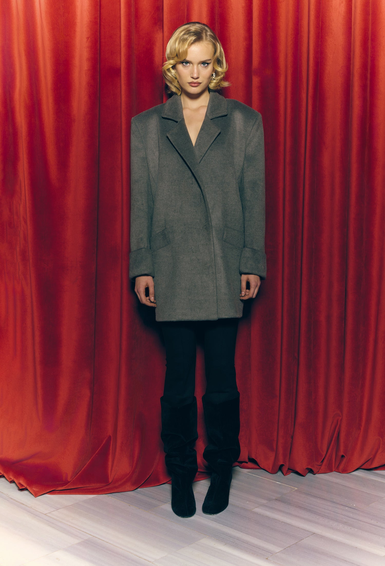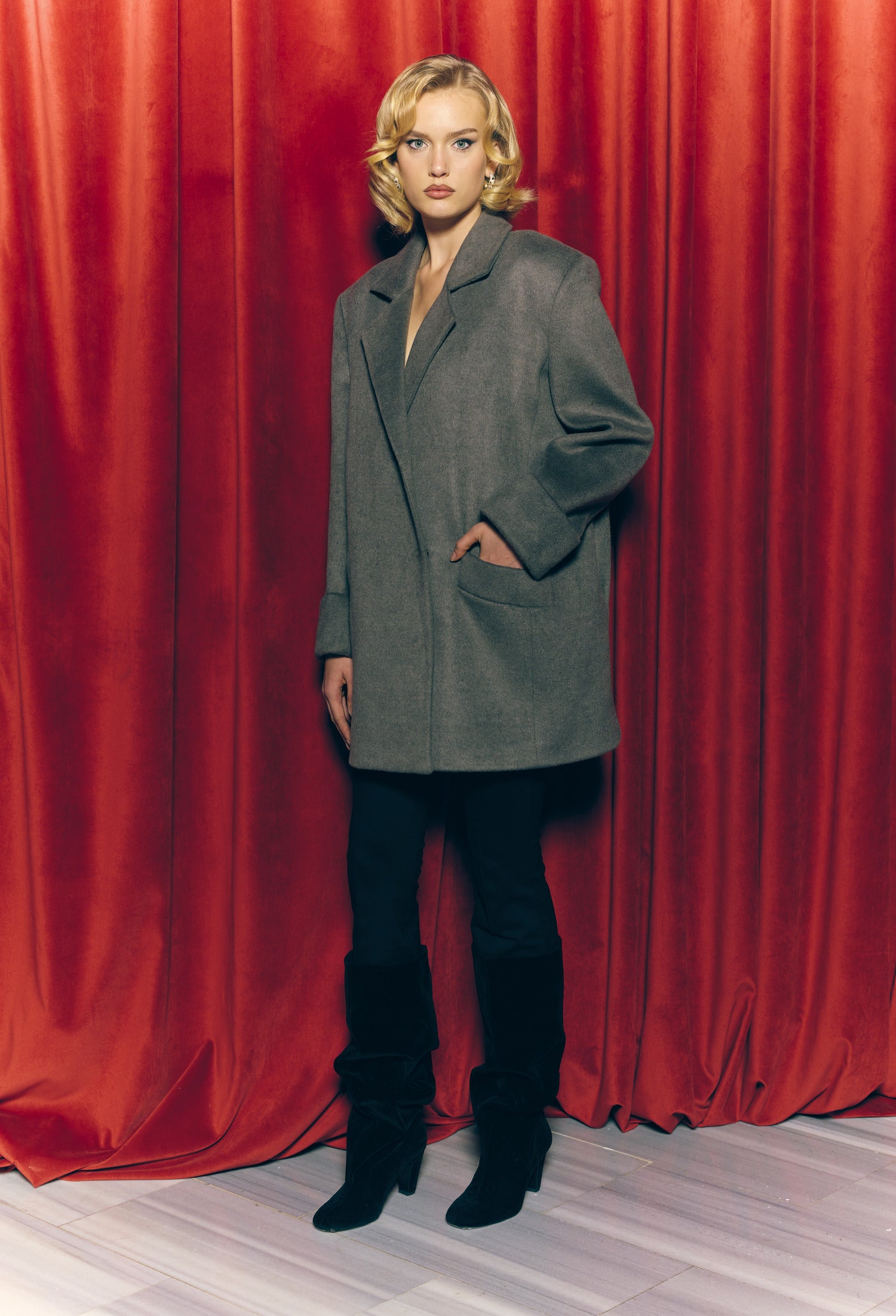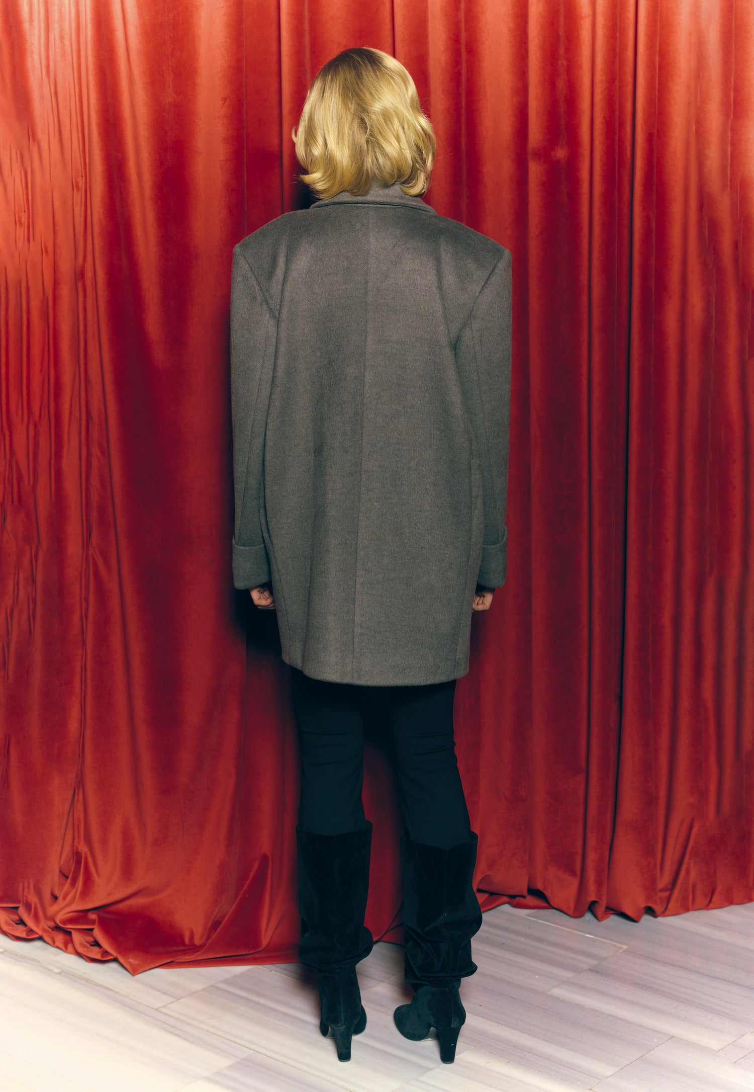 The Mila Coat in grey combines an oversized silhouette with structured elements for a refined balance of ease and definition. Broad shoulders with padded details add shape, while the relaxed fit ensures comfort. Designed as a one-size piece, it accommodates sizes 34 to 38, making it a versatile wardrobe essential.