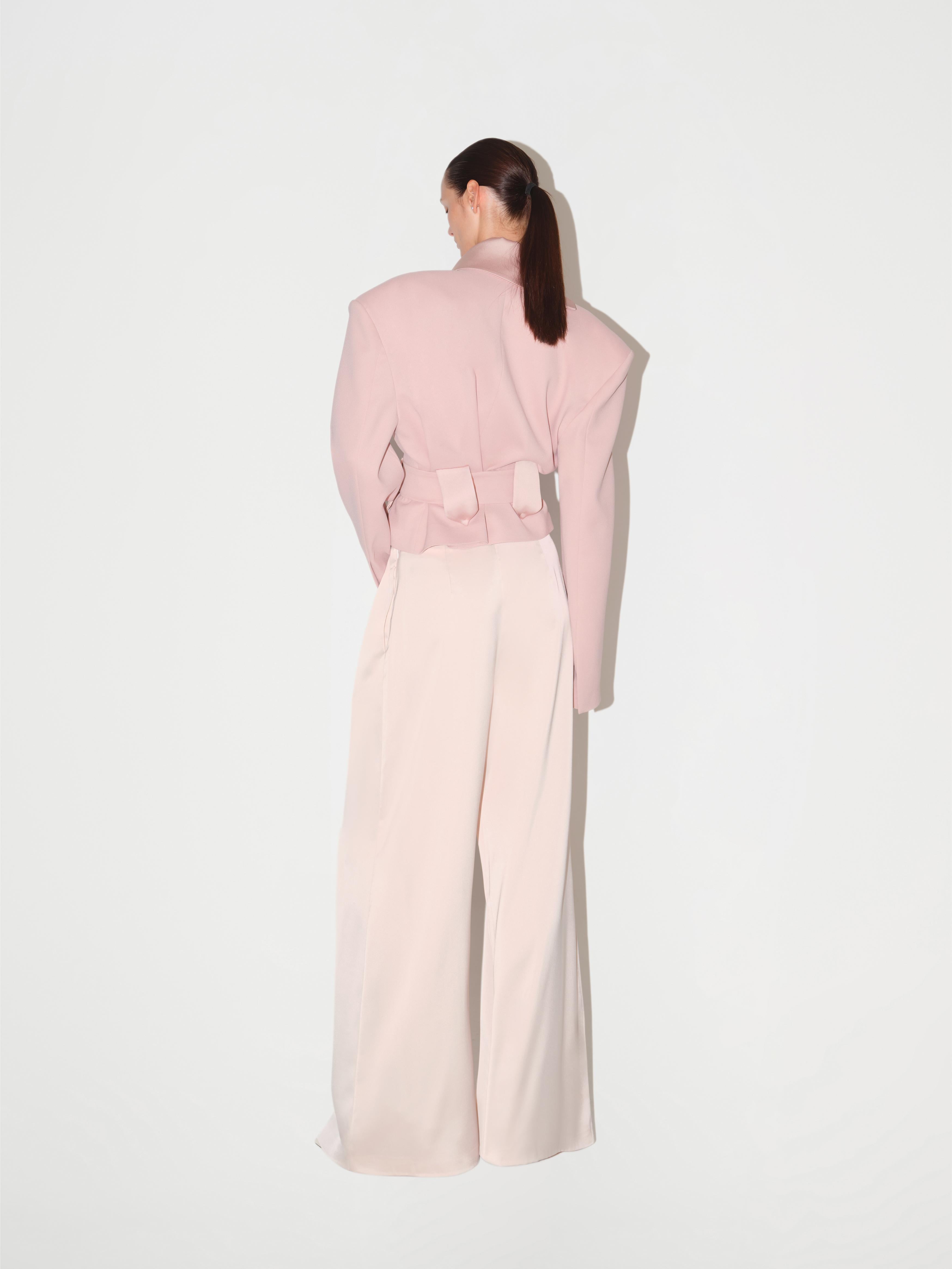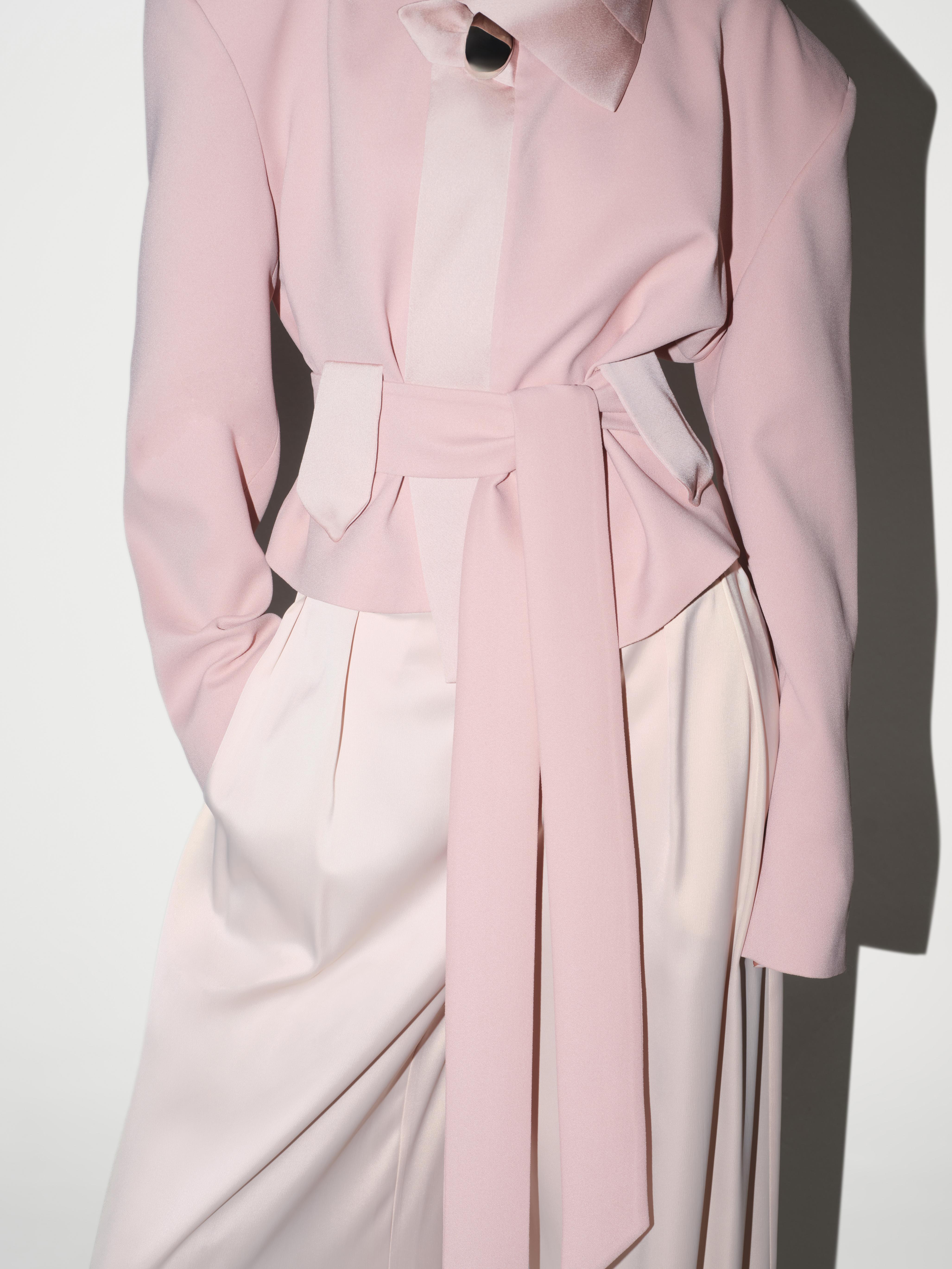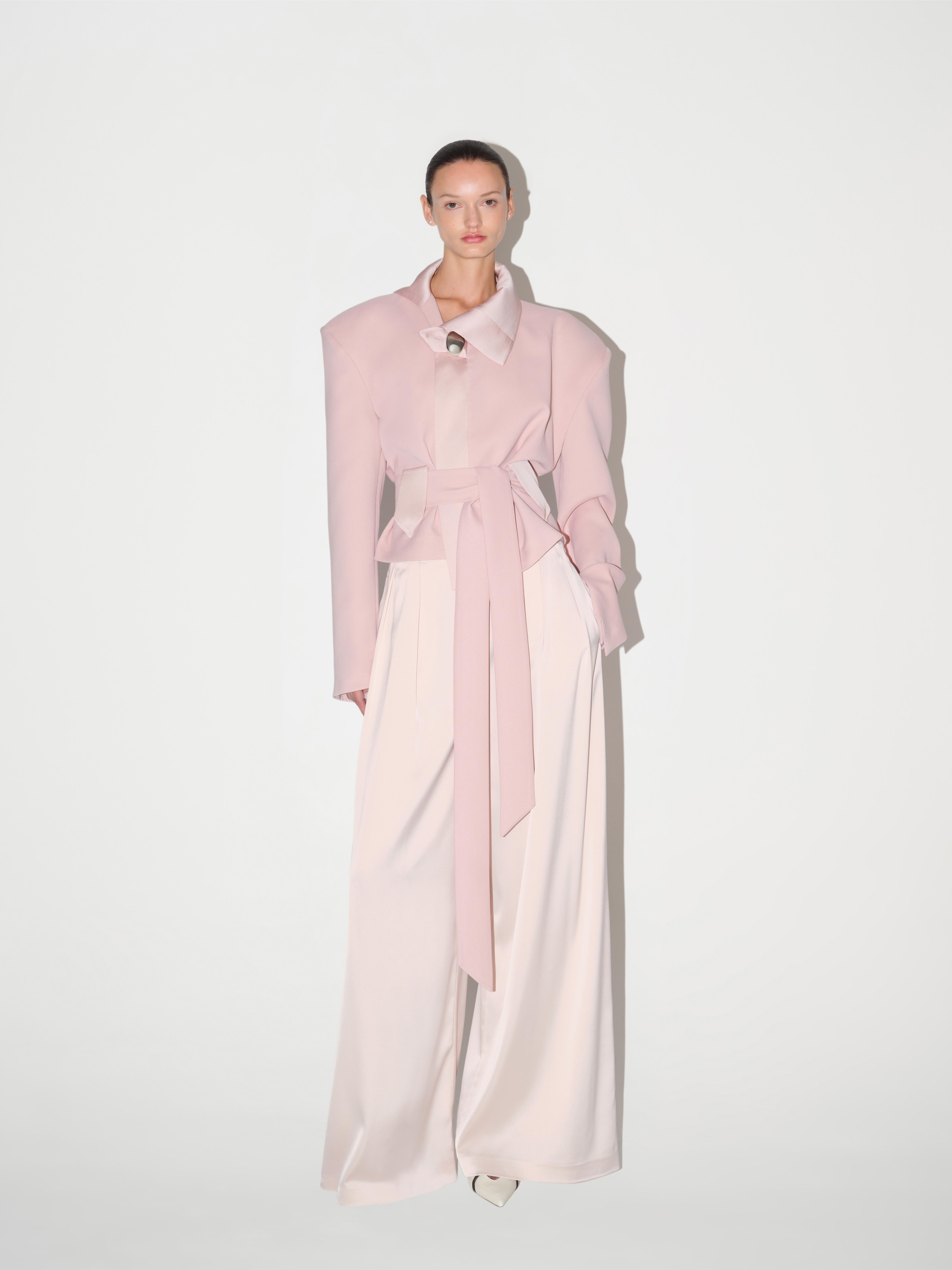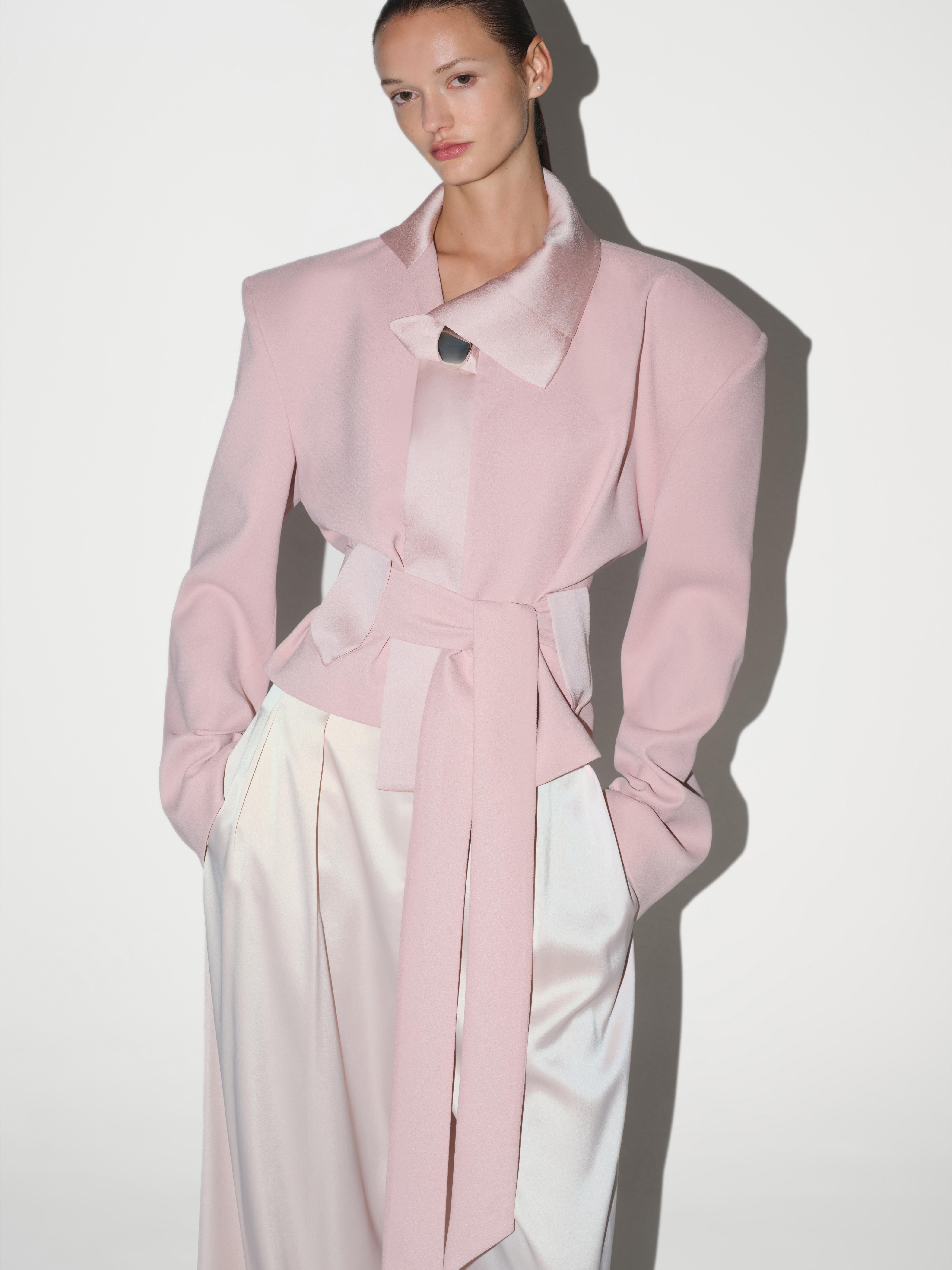 Rendered in a soft pink tone, the Twilight Jacket offers an intentionally relaxed silhouette. Dropped shoulders and a loose-cut structure give it an effortless sense of movement, while a silver closure at the neck adds a subtle point of focus. Cinch the waist with the matching belt to create shape, or leave it loose for a more unstructured look. Pair it with wide leg trousers in tonal shades for a modern, romantic ensemble.