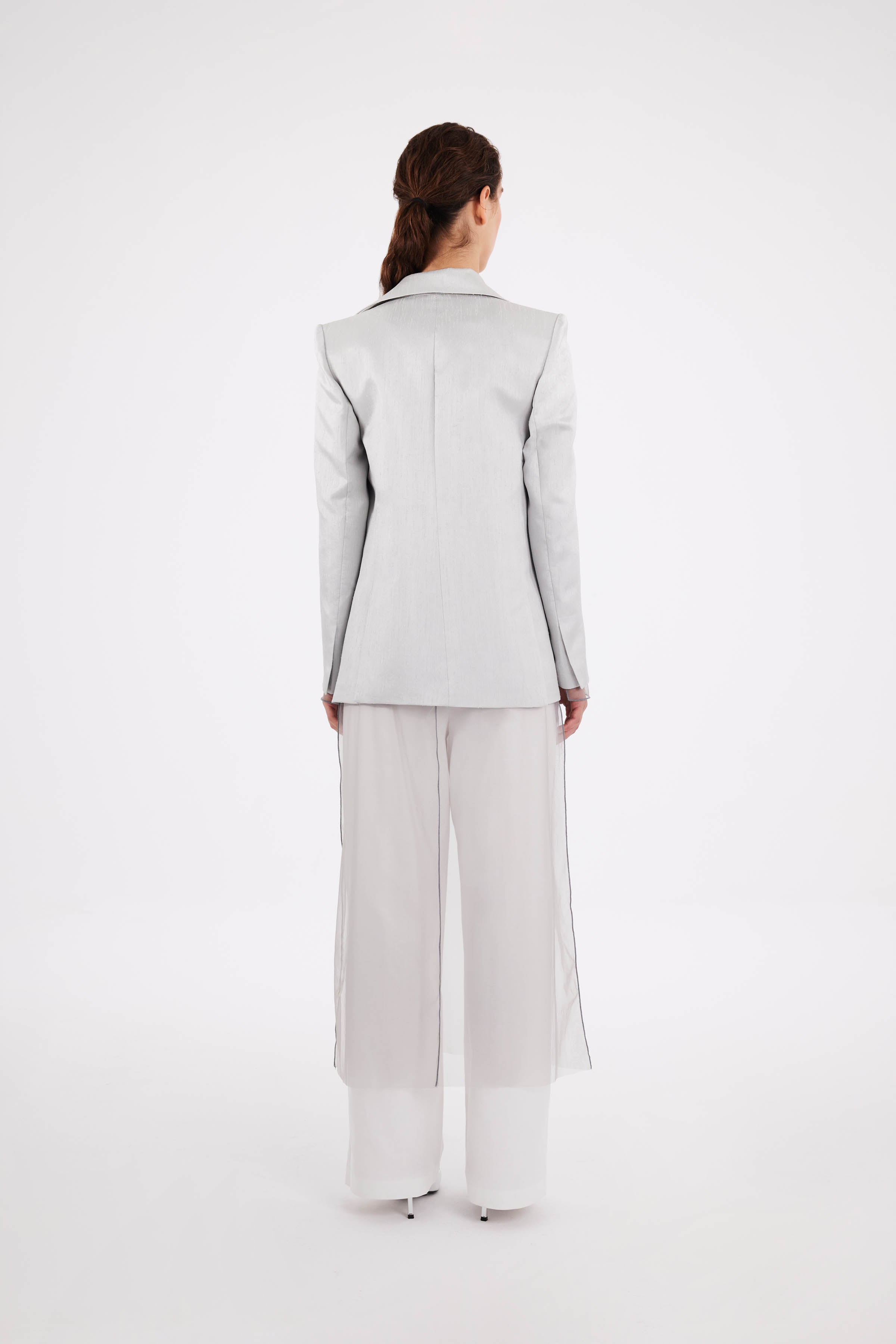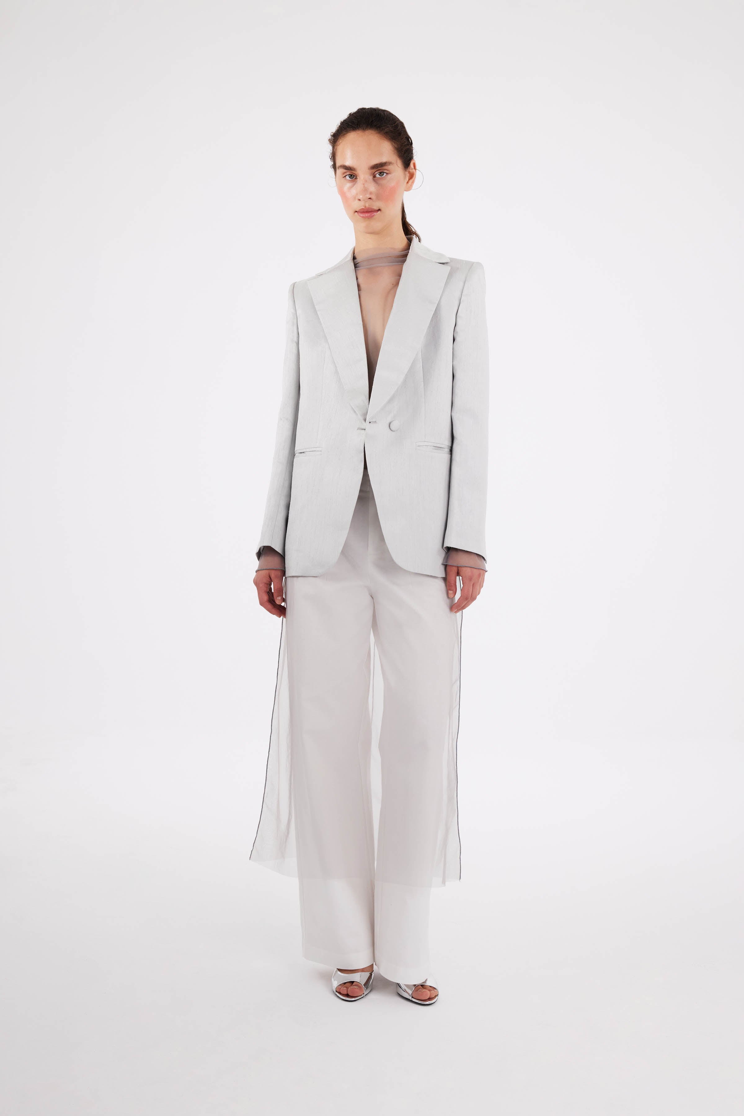 The Vega Jacket in silver offers a sculpted shape with a touch of dimension, thanks to its textured shantung satin fabric. Internal shoulder pads add definition, while the relaxed fit makes it easy to wear. Style it over a tailored jumpsuit for an event-ready look, or wear it with a fitted top and straight-leg jeans for a modern balance of structured and relaxed elements.